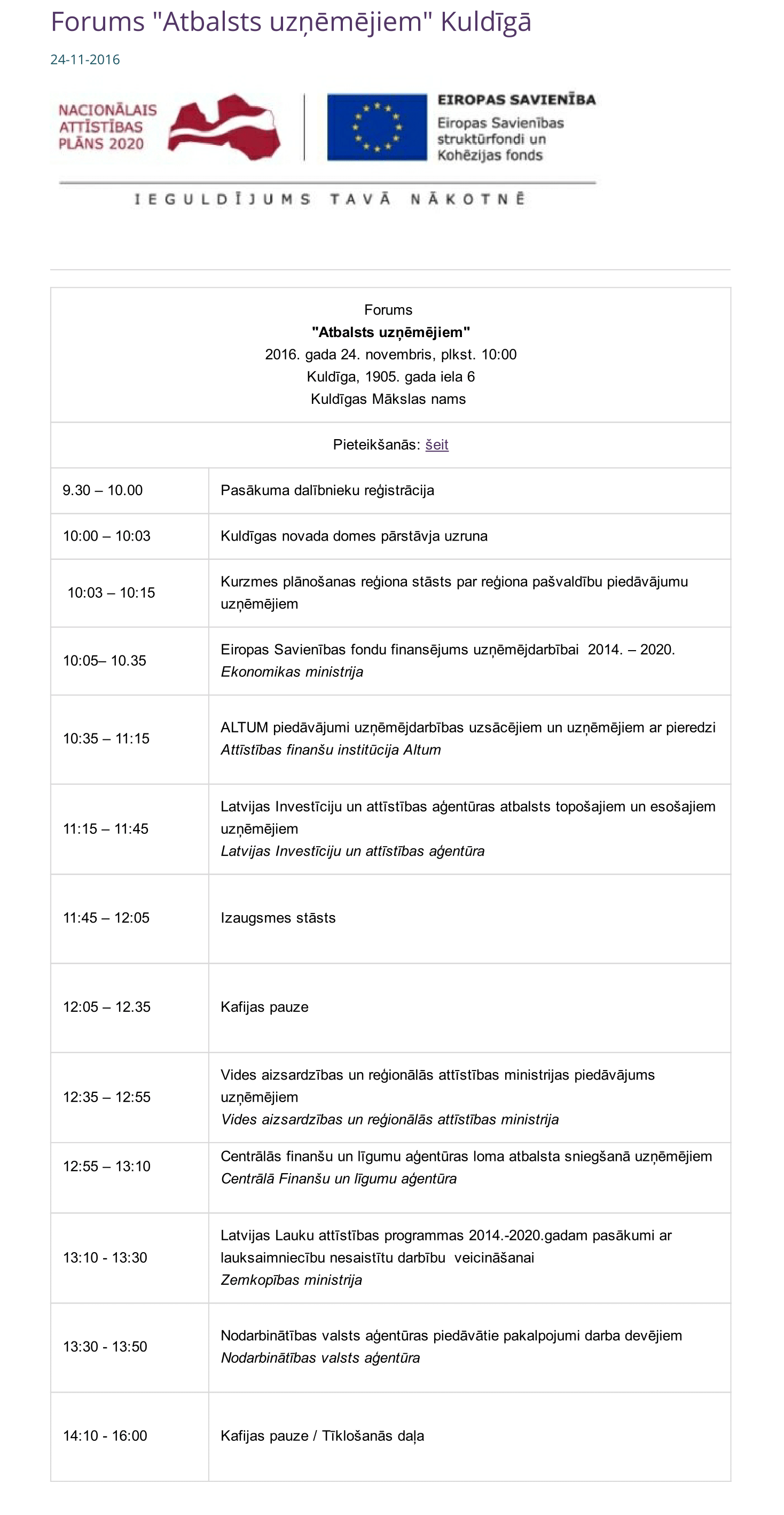 24.novembrī plkst. 10:00 Kuldīgā notiks forums “Atbalsts uzņēmējiem” https://www.em.gov.lv/lv/par_ministriju/notikumu_kalendars/12283-forums-atbalsts-uznemejiem-kuldiga Klātienē lekcijas un tikšanās ar Ekonomikas ministrijas, Attīstības finanšu institūcija Altum, Vides aizsardzības un reģionālās attīstības ministrijas, Zemkopības ministrijas, Centrālā finanšu un līgumu aģentūras, Latvijas Investīciju un attīstības aģentūras, Nodarbinātības valsts aģentūras, Lauku atbalsta dienesta, Uzņēmumu reģistra, Latvijas Lauku konsultāciju centra un Latvijas komercbanku pārstāvjiem.