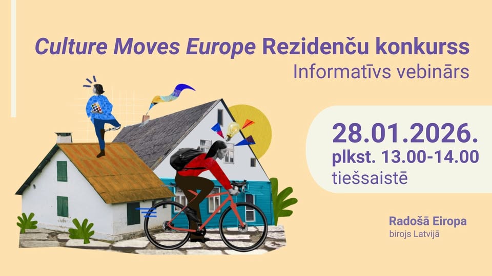 Vebināra dalībnieki tiks iepazīstināti ar ES Programmu “Radošā Eiropa” un mobilitātes shēmu Culture Moves Europe, fokusējoties uz Rezidenču konkursa nolikumu un jaunumiem 2026. gadā, kā arī ar iepriekšējā Culture Moves Europe perioda (2022.-2025.) rezidenču konkursu rezultātiem.